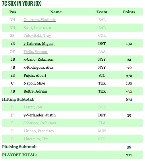 Only one SLPL team had the foresight to pick up Mike Napoli, the hard-hitting catcher for the Texas Rangers. With 30 home runs and 85 strikeouts this season, Napoli piled up 215 SLPL points, which ain’t bad, ain’t that bad at all. Even so, perennial league favorite Peggy Bocox, owner of Sox In Your Jox, couldn’t coax that kind of production from the rest of her roster and she ended the Regular Season in 43rd place.