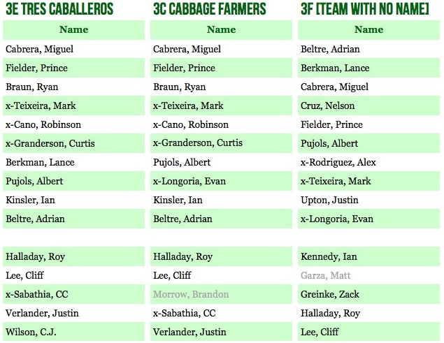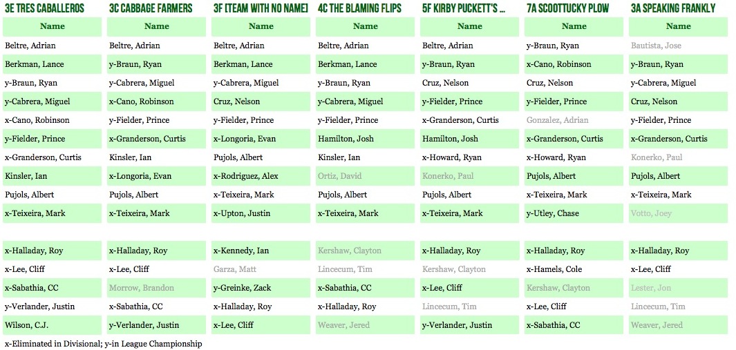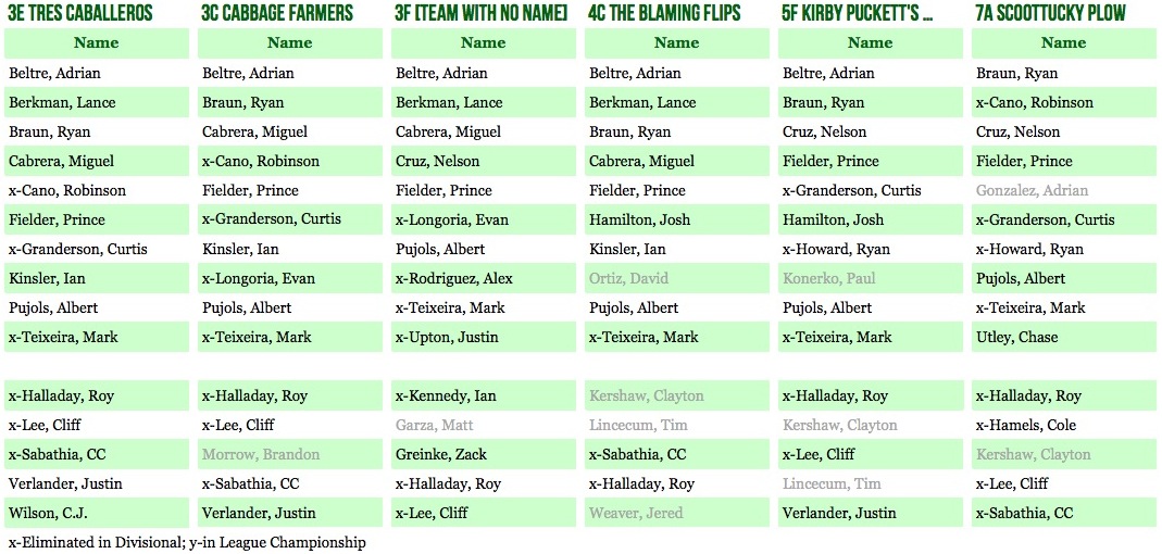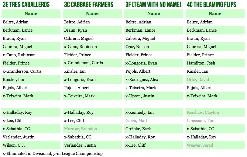 Did we say two teams? With the Yankees thankfully disposed of from the playoffs -- loved watching A-Rod return to playoff form, BTW! -- we need to amend what we said yesterday. What we meant to say was that appears the 2011 season will come town to three teams. Sure, [Team That Shall Not Be Named], owned by David Adrian, is a full 511 points out of first place in the Overall standings and 116 points behind in the Playoffs, but the dude still has some difference makers left … and points go up a lot in each of the remaining rounds of the playoffs. Lots of questions about whether or not he can really pull it off, but we’re just giddy as hell over here with the thought that we might actually have to give the 2011 crown to a team whose name we can’t even bring ourselves to write publicly on this blog!