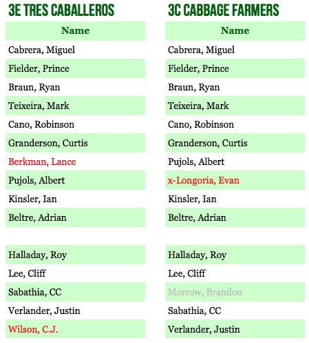 Cabbage Farmers owner Paul Martin has the lead Overall and in the Playoff standings, but he started with one fewer pitcher and has since lost Evan Longoria. Tres Caballeros owner Jim Klinkhamer, meanwhile, has two difference makers and is hot on the trail of the lead in the Playoff standings, sitting just six points for games played through last night.